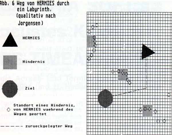 Selbstverständlich ist die Entwicklung von KI untrennbar mit der Entwicklung von Handhabungsautomaten (Originalton DIN) verbunden. Die zur Zeit in der Anwendung befindlichen Industrieroboter sind nämlich ziemlich „dumm“ und verlangen viel Programmieraufwand. So kann es bei ungeschickter Programmierung Vorkommen, daß zu dicht plazierte Roboter ohne tiefere Erkenntnis auf sich einschlagen und sich gegenseitig zerstören. Vom idealen Roboter werden deshalb menschenähnliches Orientierungsvermögen, Tastsinn, Seh- und Hörvermögen verlangt. Daß zumindest das Sehvermögen KI verlangt, ist wohl klar, wenn man sich an die verschiedensten optischen Täuschungen erinnert, mit denen uns unser Gehirn immer wieder überrascht. Solche optischen Täuschungen haben ihre Ursache nicht in einer fehlerhaften Optik, sondern sind auf die komplexe Auswertungssoftware in unserem Gehirn zurückzuführen. In einem sehr interessanten Artikel in der Zeitschrift BYTE [5] erläutern die Autoren, wie sie mit Hilfe von auf Rahmen basierender Wissensrepräsentation ein einfaches visuelles Erkennungssystem in PROLOG implementiert haben (Quelltext inclusive!). Dieses Programmsystem ist in der Lage, die Architektur einfacher Serienhäuser zu erkennen und ggf. architektonische Verbesserungsvorschläge zu machen. Die Autoren betonen allerdings, daß ihr System von der geringen Modellzahl der untersuchten Serienhäuser profitiert. Es gibt dagegen ein universelles visuelles System namens ACRO-NYM, welches in Stanford (der Name kommt in diesem Aufsatz öfter vor) von T. Binford entwickelt wurde [2], Wesentlich mehr Schwierigkeiten bereitet den Forschern aber seltsamerweise die Entwicklung multipler Manipulatoren, wie sie. erforderlich sind, um feinmechanische Aktivitäten in den Griff zu bekommen. Für einen zweiarmigen Roboter stellt z. B. die Aufgabe, einen Bleistift waagerecht zwischen den „Fingern“ zu halten und dessen Enden gegenläufig kreisen zu lassen, ein enormes Problem dar. Zur Bewältigung dieser Aufgabe müssen nämlich eine Vielzahl sensorischer Daten in Echtzeit empfangen und koordiniert werden. Ein Gesamtkontrollsystem eines zukünftigen zweiarmigen intelligenten Roboters zeigt Abb. 5 [9]. Natürlich darf die selbständige Roboternavigation im Reigen der KI nicht fehlen. Man sieht ja manchmal schon Transportroboter durch menschenleere Fabrikhallen huschen, aber diese laufen allesamt in besonders präparierten Umgebungen. Ziel der autonomen Navigation ist es, einem Roboter beizubringen, in einem ihm unbekannten Raum vom momentanen Standpunkt aus zu einem vorgegebenen Ziel zu gelangen. Natürlich müssen evtl, vorhandene Hindernisse erkannt und umgangen werden. Außerdem sollte möglichst schnell der kürzeste Weg zum Ziel gefunden werden. Und falls der Roboter nun doch einmal in der Gegend herumirrt, sollte er wenigstens in der Lage sein, aus seinen Fehlern zu lernen und während seiner Erfahrt eine genauere Karte seiner Umgebung anfertigen [10]. Stand der Dinge sind Geräte mit der Leistung von HERMIES, einem PC auf Rädern mit einem Sonarsystem [11]. Abb. 6 zeigt, wie er sein Ziel erreicht. Die Hindernisse waren nicht einprogrammiert, sondern wurden im Verlauf der Bewegung geortet.