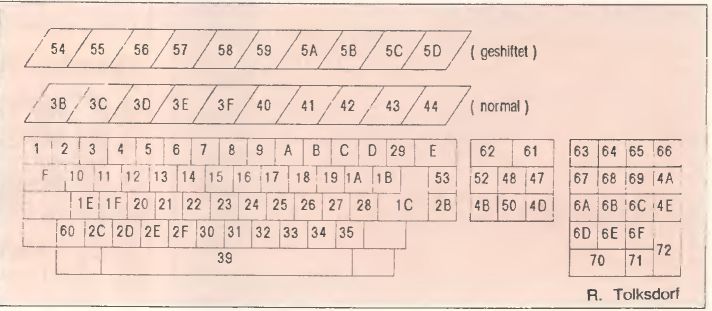 Normale Eingaberoutinen (Read, Input, ...), egal welche Sprache, liefern meist nur den ASCII-Code des eingegebenen Zeichens. Beim ST ist jeder Taste allerdings ein weiterer Code zugeteilt, der SCAN-Code. Mit ihm kommt man auch an die Funk-tions- und andere Sondertasten heran, die keinem ASCII-Zeichen entsprechen.