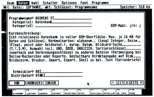 Adimens ST ist eine solche relationale Datenbank. Das Programm wurde von dem renommierten deutschen Softwarehaus ADI entwickelt. Mit ihm kann man bis zu 16 unterschiedliche logische Dateien miteinander verknüpfen. Das erspart ein mehrfaches Erfassen und Ändern von Daten. Adimens verfügt über eine eigene "Shell", über die einzelne Programm-Module aufgerufen werden können. Das Programmpaket besteht aus folgenden Bestandteilen: