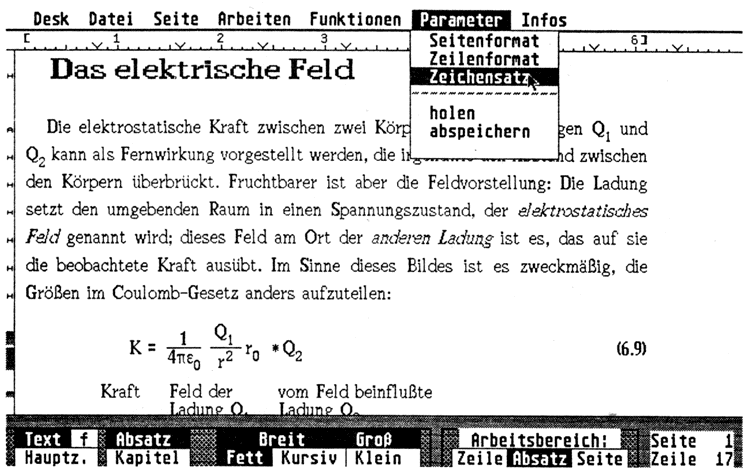 Da die gesamte Textverarbeitung im Graphikmodus abläuft, gibt es bei Signum keine Beschränkung bei der Positionierung der Zeichen. Nicht Zeilen und Spalten bestimmen das Schriftbild, sondern der Benutzer kann jeden Buchstaben frei plazieren. Somit ist das Schreiben von naturwissenschaftlichen Formeln und Brüchen ein Kinderspiel. Diese Anwendung war auch der Anlaß für Franz Schmerbeck, den Autor von SIGNUM, ein neues Textverarbeitungskonzept zu entwickeln.