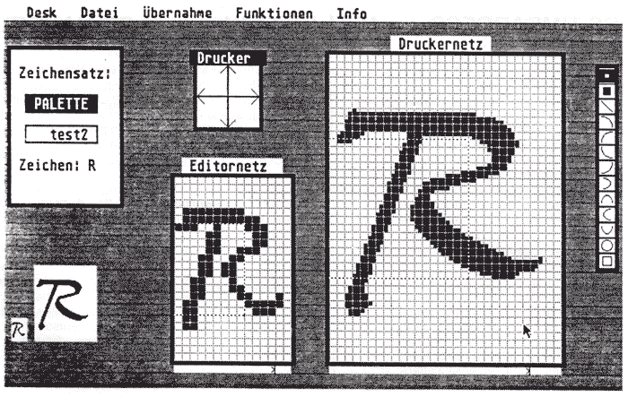 Die Zeichen können im Editornetz oder im Druckernetz erstellt werden, wobei sich das Druckernetz, wegen der besseren Auflösung, anbietet. Durch einen einfachen Mausklick werden sie dann in das jeweils andere Netz übernommen.