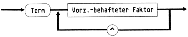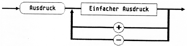 In Bild 2 ist nun allgemein ein arithmetischer Ausdruck dargestellt, der aus beliebig vielen einfachen Ausdrücken besteht, die über das Plus- oder Minuszeichen verknüpft sein können. Dies ist durch die Abzweigung hinter dem Käsen „Einfacher Ausdruck“ verdeutlicht, was bedeutet, daß hier abgebogen wird solange einem Teilausdruck ein Plus- oder Minusoperator folgt.