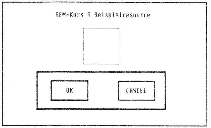Ganz oben steht ein Objekt mit Namen BEISPIEL. Es ist die sogenannte Wurzel des Objektbaumes. Die Wurzel ist immer dasjenige Objekt im Baum, das mit dem Index 0 bezeichnet wird, sozusagen der Einstieg oder Zugang zu allen anderen Objekten. Bei einem Dialogbaum steht die Wurzel gleichzeitig für den Rahmen um den Dialog. Alle anderen Teile müssen vollständig in diesen Rahmen passen. Das führt uns gleich zu einem weiteren wichtigen Begriff. Zu jedem Objekt gehört eine sogenannte „Bounding Box“, also ein umschließendes Rechteck. Die Regeln für GEM-Objektbäume sagen nun, daß jedes im Baum tieferliegende Objekt vollständig innerhalb der Bounding Box seines Vorgängers liegen muß. Außerdem dürfen sich die Bounding Boxes von Objekten auf gleicher Ebene normalerweise nicht überlappen. Aber zurück zum Beispiel: Nach der Wurzel stehen nebeneinander auf gleicher Ebene drei Objekte. Ein String (TITEL), ein Quadrat (SMILEY; Warum ich es so genannt habe, wird erst im nächsten Teil verraten) und ein großes Rechteck mit dickem Rand (BIGBOX). BIGBOX selber hat wiederum zwei untergeordnete Objekte (OK und CANCEL), die üblichen Exit Buttons, die Sie ja schon aus der letzten Folge kennen.