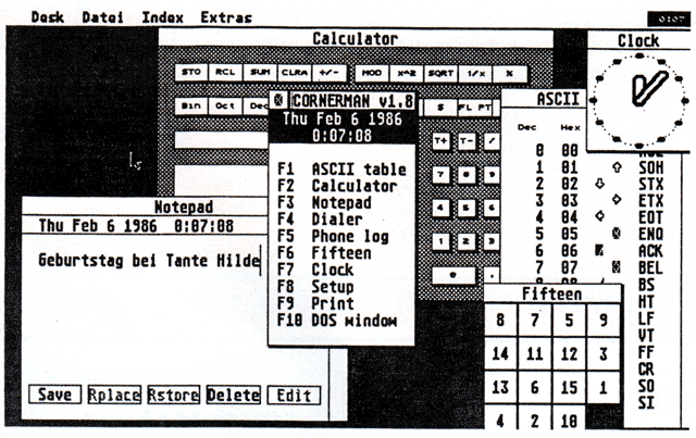 Die Ideen, die in solchen Programmen stecken, sind sehr vielseitig. Der Grundgedanke ist es, oft benötigte Hilfsprogramme aufrufen zu können, ohne das laufende Programm zu verlassen. Dazu gehören beispielsweise Terminkalender, Uhr, Wecker oder etwa ein Notizblock. Wäre es nicht praktisch, wenn man automatisch an einen bestimmten Termin erinnert würde oder zum schnellen Errechnen des Lottogewinns mal eben einen Taschenrechner aus dem Rolladen ziehen könnte. Unsere drei Testprogramme beinhalten solche Hilfsprogramme und nehmen dem Benutzer einige Arbeit ab.