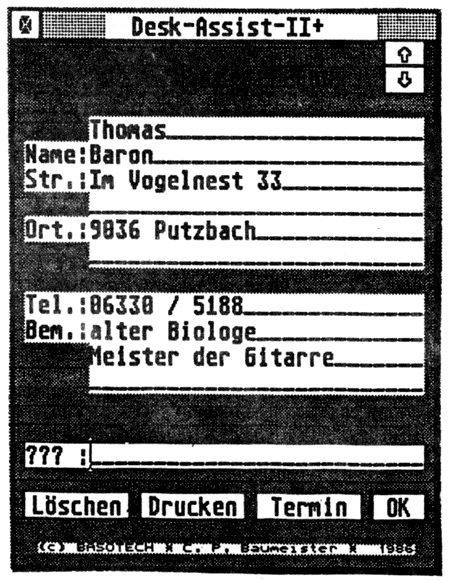 Neben einem Notizblock, der sich, wie sollte es auch anders sein, zur Aufnahme von Notizen eignet, wurde eine ASCII-Tabelle eingebaut, die jederzeit die ASCII-Codes sichtbar macht. Besonderen Wert legte der Autor auf eine automatische Telefonwähleinrichtung, die auf Befehl die zu einer Adresse gehörende Telefonnummer wählt und somit das lästige Nummerntippen erübrigt. Schade ist natürlich, daß dies nicht ohne zusätzliche Hardware funktioniert, auch die Nutzung als Adressdatei ist aufgrund der vorgegebenen Nummernmaske, die hierzulande unpassend ist, fraglich.