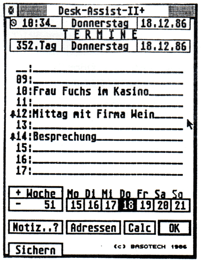 Natürlich sind die Druckerbefehle nur ein Teil dessen, was ein Desk-Utility beherrschen sollte. Wie auch bei den anderen Programmen wird auch hier Wert auf Notizblock und Terminkalender gelegt, wobei gerade der Terminkalender recht schön gelungen ist. Neben den Wochentagen werden auch Feiertage, da es sich dabei um besonders wichtige Tage im Jahr handelt, angezeigt und zwar mit dem entsprechenden Namen. Zudem kann jeder Termin mit einem akustischen Signal hervorgehoben werden.