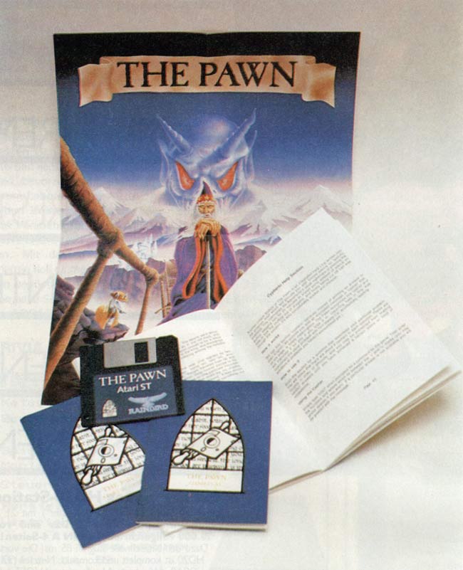 Nun hat die Firma RAINBIRD vor einigen Monaten das Adventure THE PAWN auf den Markt gebracht, das so einiges auf dem Markt schlägt, was es zu kaufen gibt. Es gehört zu der Kategorie der Grafikadventures, allerdings ist diese Einstufung wohl eher untertrieben, denn die Grafiken die THE PAWN Liefert, sind als sehr gut zu bezeichnen. Gerade dies animiert den Spieler immer wieder, tiefer in das Geheimnis des Adventures einzudringen. Die ganze Aufmachung des Spiels muß von Grund auf durchdacht worden sein, denn das, was man für sein Geld bekommt, ist wirklich enorm. Allein die Verpackung macht schon einen sehr guten Eindruck, allerdings kann dieser Eindruck oftmals täuschen. Eine feste Verpackung, die grafisch sehr schön gestaltet worden ist: Die Zeichnung auf der Verpackung, die als Titelbild im Programm zu sehen ist, wird sogar als kleines Poster mitgeliefert. Das Beste allerdings ist ein kleines Büchlein, das keiner, der ein wenig Englisch versteht und gerne Adventures (besonders dieses) spielt, missen sollte. Es enthält außer ein paar Tips (dazu später mehr) eine famos erzählte Geschichte aus dem Land KEROVNIA, in dem sich THE PAWN abspielt. Ich möchte hier keine Inhaltsangabe machen; ich kann aber jedem empfehlen, der das Adventure besitzt oder kauft, sich die Geschichte einmal zu Gemüte zu führen; es lohnt sich.