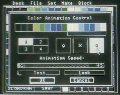 Bereits die Demo bringt es ans Licht: DEGAS ELITE beherrscht endlich die sogenannte Farbpaletten-Animation. Mit ihr können auf einfache Weise Bewegungseffekte erzeugt werden. Das Verfahren dürfte jedem ST-Besitzer bereits von dem PD-Programm NEOchrome her bekannt sein, es ist jedoch hier noch verbessert worden. Das Prinzip ist, wie gesagt, ganz einfach: Ein bestimmter Bereich der Farbpalette wird in Rotation versetzt, während die restlichen Farben unverändert bleiben. Bei der Animations-Demo werden die Farben des Flusses bewegt, während die der Umgebung in Ruhe bleiben. Natürlich können auch alle Farben rotieren, aber dann wäre das Bild sehr unruhig und wirr. Durch eine einfache Änderung der Rotationsrichtung ist es auch möglich, den Fluß 'rückwärts’ fließen zu lassen (probieren Sie es aus!). Auch die ’Fließgeschwindigkeit’ kann geändert werden. So kann entweder ein reißender Fluß oder ein stiller Bach gezeigt werden. Die Möglichkeiten sind fast unbegrenzt.