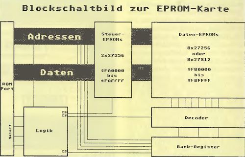 Einige Leser werden -sich fragen, wie eine so große Speicherkapazität zu erzielen ist. Der ROM-Speicher läßt sich laut Herstellerangaben um maximal 128 KByte erweitern, und die bisher erschienenen EPROM-Karten hatten auch nur diese Kapazität. Der Trick bei unserer EPROM-Karte heißt „Bank-Switching“: Die Daten der EPROMs werden in Blöcken zu 128 KByte in den Rechner kopiert. Die auf der Karte integrierte Steuerelektronik und Software sorgt dann dafür, daß diese Blöcke nahtlos nacheinander geladen werden, ohne daß sich der Anwender darum kümmern muß. Es handelt sich also um eine gebankte EPROM-Karte, die bis zu zehn EPROMs aufnehmen kann. Zwei dieser EPROMs sind immer sogenannte Steuer-EPROMs des Typs 27256, die die benötigte Software enthalten. Die verbleibenden acht EPROMs entsprechen der eigentlichen EPROM-Bank, die wahlweise mit den Typen 27256 oder 27512 bestückt werden kann (siehe Blockschaltbild 1). Die Anzahl der benötigten EPROMs richtet sich natürlich nach der Länge des oder der gewünschten Programme. Sie müssen die Karte also nicht unbedingt mit allen EPROMs bestücken. Verwendet man die Karte mit zehn EPROMs und hat man eventuell noch den Easyprommer angeschlossen, so empfiehlt sich die Verwendung sogenannter CMOS-EPROMs (z. B. 27C256), die sich durch geringeren Stromverbrauch auszeichnen. Mit einem Jumper (kleiner Stecker) selektiert man den verwendeten EPROM-Typ. Mit einem weiteren Jumper läßt sich die gesamte Karte abschalten, so daß sie nicht jedesmal aus dem Modul-Port des ST herausgezogen werden muß, wenn sie nicht benötigt wird.