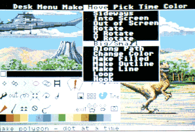 Die dritte und etwas ausgefallenere Animationstechnik des Animators nennt sich 'Metaphoric Animation'. Das funktioniert so: Mit dem Animator lassen sich beliebige, gefüllte oder nicht gefüllte Polygone erzeugen und manipulieren. Man zeichnet ein Polygon und verändert es; das Programm merkt sich den Ablauf der Veränderungen. Eine ganze Reihe von Verschiebungs- und Rotationsmöglichkeiten stehen dabei zur Verfügung (und noch vieles mehr), die alle auch in einem Bewegungsablauf kombiniert werden können.