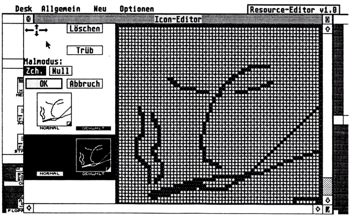 “Das dritte und letzte Kommando in der Menüzeile hilft bei der Erstellung von Resourcen für die mittlere Auflösung auf dem monochromen Monitor. Es bewirkt bei allen Verschiebe-Operationen, bei denen man mit der Maus den Umriß des Objektes bewegt, daß dieser Umriß seiner Größe in der mittleren Auflösung entspricht, also doppelt so hoch erscheint. Damit kann der Platzbedarf in der mittleren Auflösung besser eingeschätzt werden. Alle weiteren Editierfunktionen sind nicht über die Menüleiste zugänglich.