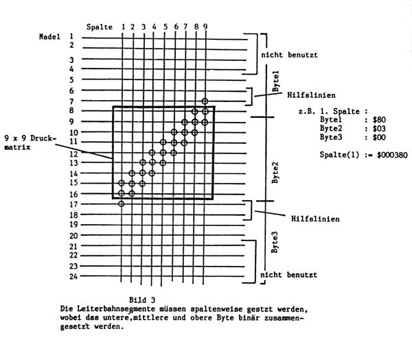 Um notwendige Überlappungen an den Ecken zu erreichen, benötigt man jedoch 13 (bzw. 24 in der Vergrößerung) waagerechte Zeilen. Bei dem 1 : 1-Ausdruck werden, da spaltenweise gedruckt wird, von den 24 Nadeln nur 13 wirklich benutzt. Hierbei können im Prinzip also alle Drucker mit mindestens 13 Nadeln verwendet werden, wobei sich bei anderen Druckern jedoch die Byte-Zusammensetzung der Graphikmatrizen von der hier verwendeten 3-Byte-Übertragung unterscheiden kann.