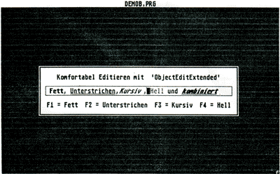Eine kleine Demonstration der Benutzung von ,ObjectEditExtended“ findet sich in Listing 2. Die dabei verwendete einfache Dialogbox-Resource (siehe Bild 1) wurde mit dem Programm ,RSCMAKER“ aus dem Modula-2 Toolkit umgewandelt.