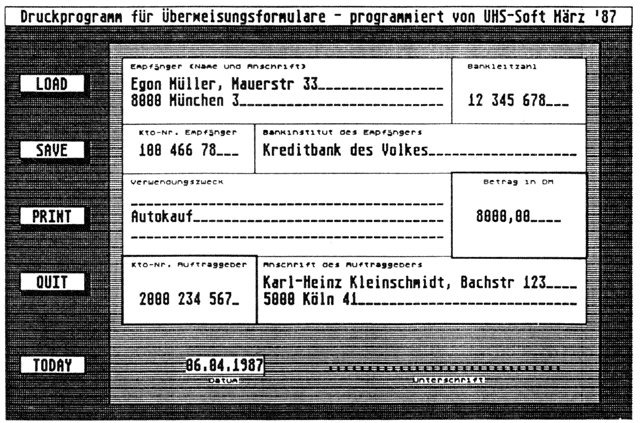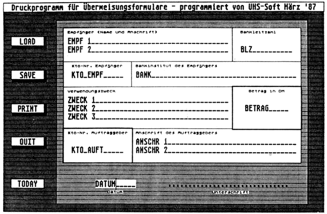 "Druckprogramn für Überweisungsformulare - programmiert von UHS-Soft März ‘87");
