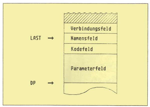 Der Benutzer kann DP z. B. mit Hilfe des Wortes ALLOT manipulieren, wobei ALLOT die oberste Zahl im Stack zum momentanen Wert von DP addiert. Auch jede Erweiterung des Wörterbuchs um eine neue Wortdefinition verändert den Inhalt von DP, da jede Wortdefinition eine bestimmte Anzahl von Bytes im Wörterbuch belegt. Jede Wortdefinition (auch Konstanten, Variablen usw. werden als Wortdefinitionen bezeichnet) weist einen einheitlichen Aufbau auf. Abb. 1 zeigt den allgemeinen Aufbau einer Wortdefinition, wie sie im Wörterbuch abgelegt wird.