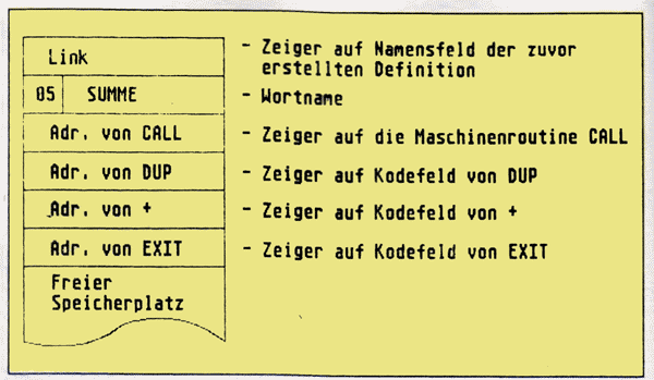 Schauen wir uns den Aufbau der einzelnen Felder etwas genauer an. Da wäre zunächst das Verbindungsfeld. Es enthält einen 16 Bit Zeiger, der auf das Namensfeld der zuletzt gemachten Definition zeigt. Auch diese Definition enthält in ihrem Verbindungsfeld wiederum einen Zeiger auf die davor gemachte Definition. Da durch dieses Feld so alle Wörter des Wörterbuches miteinander verbunden werden, wird es als „Link-“ bzw. Verbindungsfeld (engl. Link = verbinden) bezeichnet. Dem Verbindungsfeld folgt das Namensfeld, das mit einem Byte beginnt, das u. a. die Länge des Wortnamens enthält. An dieses Byte schließt sich der Wortname des betreffenden Wortes an. Dem Namensfeld folgt das Codefeld, welches ebenfalls einen 16 Bit Zeiger enthält. Dieser Zeiger adressiert eine Maschinenroutine mit, die für das Ausführungsverhalten des betreffenden Wortes verantwortlich ist. Sie wissen, daß ein durch definiertes Wort bei seiner Ausführung alle in ihm enthaltenen Komponentenwörter zur Ausführung bringt. Genau dieses Verhalten wird durch die Maschinenroutine festgelegt, auf die der Codefeldzeiger eines durch definierten Wortes zeigt (diese Routine wird meistens als CALL bezeichnet). Somit enthalten alle durch definierten Worte den selben Zeiger im Codefeld.