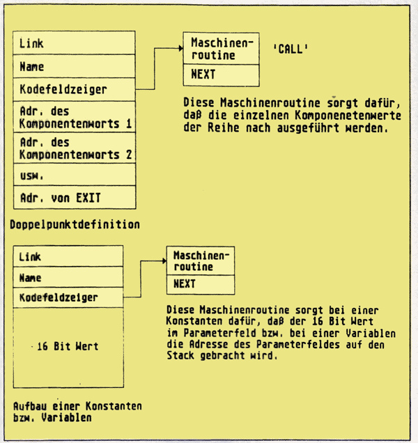 Auch eine Variable - bzw. Konstantendefinition entspricht dem allgemeinen Schema aus Abb. 1, allerdings mit zwei Unterschieden. Zum einen besteht das Parameterfeld lediglich aus dem 16 Bit Wert der Variablen bzw. der Konstanten. Zum anderen zeigt das Codefeld eines durch VARIABLE definierten Wortes auf eine Maschinenroutine, die dafür sorgt, daß bei Aufruf dieses Wortes die Parameterfeldadresse auf den Stack gebracht wird. Genauso zeigt das Codefeld eines durch CONSTANT definierten Wortes auf eine Maschinenroutine, die dafür sorgt, daß bei Aufruf des betreffenden Wortes der im Parameterfeld gespeicherte Wert auf den Stack gebracht wird. Jede dieser Maschinenroutinen endet übrigens mit einem Sprung zum Adreßinterpreter (NEXT), der in der nächsten Folge etwas ausführlicher vorgestellt wird. Abb. 3 zeigt den allgemeinen Aufbau eines durch :, CONSTANT bzw. VARIABLE definierten Wortes.