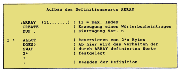 Ein in Lehrbüchern gern verwendetes Beispiel ist die Definition eines Definitionswortes für Feldvariablen, da im FORTH-83 Standard keine Feldtypen definiert sind. Was liegt näher, als die Definition eines Definitionswortes zur Definition von Feldern nachzuholen. Das Definitionswort soll ARRAY heißen und in der Form