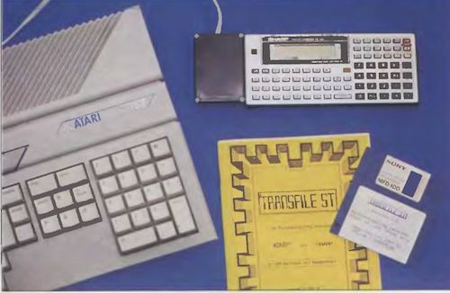 Wenn nun der Besitzer dieses Taschenrechners auch noch im Besitz eines Homecomputers oder eines Personalcomputers wie dem Atari ST ist, liegt die Idee doch sehr nahe, die Programme des Taschenrechners auf dem 'großen Bruder’ abzuspeichern und zu editieren. Erstens hat der große Bruder meist eine angeschlossene Diskettenstation und zweitens einen Bildschirm, der natürlich mehr als zwei Zeilen Text darstellen kann. Diesem Anliegen hat sich nun die Firma YELLOW-COMPUTING angenommen, deren Interface und Software durch die Firma ECPS vertrieben werden. Dieses Programm TRANSFILE ST und dazugehörige Interface ermöglichen die Kopplung von SHARP-Taschencomputern der Typen SHARP PC 14xx, PC 126x und PC 13xx mit einem ATARI ST Computer. Damit ist es möglich, Programme und Daten eines SHARP-Taschenrechners in den Speicher des ATARI-ST-Computers zu übertragen und mit einem komfortablen Editor zu bearbeiten, um sie dann direkt auf Diskette zu speichern. Das Programm erzeugt Standard ASCII-Files, womit eine Softwareverträglichkeit mit allen wichtigen ATARI Hilfsprogrammen gewährleistet ist. Natürlich können die im ATARI befindlichen Daten auch wieder in den SHARP zurückgeladen werden. Dabei erfolgt die Datenübertragung über die Centronics-Druckerschnittstelle, wobei der Drucker an das Interface angeschlossen und damit durchgeschleift werden kann. Das Interface, das etwa die doppelte Größe einer Streichholzsschachtel hat, wird direkt in die Schnittstelle des Taschenrechners gesteckt und mit einem Kabel zum ATARI verbunden. Die Übertragung der Daten geschieht vom Taschenrechner aus sehr unproblematisch mit den Befehlen ’CLOAD’ und ’CSAVE’ oder ’PRINT#’. Selbst Speicherbereiche können durch den Befehl ’CSAVE M’ übertragen werden.