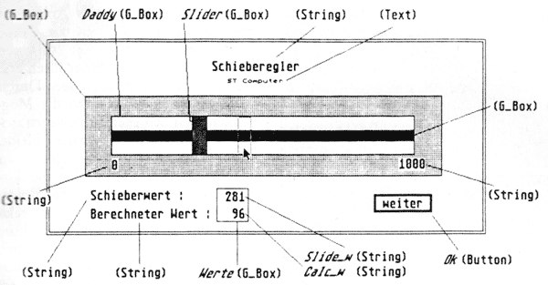 Nun kommen wir zur Do...Loop-Schleife. Sie wird erst dann verlassen, wenn der weiter-Button (Ok) angeklickt wird. Klickt man also auf den Schieber der Box, bleibt man immer noch in der Schleife. Dadurch wird es uns ermöglicht, den Regler überhaupt zu verschieben, da durch Anklicken des TOUCHEXIT erklärten Schiebers die Form_do-Routine verlassen wird und die übrigen Prozeduren erst angesprochen werden können. Durch Graf_slidebox erhält man die Möglichkeit, den Schieber zu bewegen, solange ein Mausknopf gedrückt bleibt. Läßt man ihn los, wird der Schieber an die Stelle positioniert, an der man losgelassen hat. Dazu dienen die Routinen Set_xrel, mit der die neue relative X-Position in die Objektstruktur geschrieben, und Objc_update, mit der der Inhalt der äußeren Box (Daddy) neu gezeichnet wird. Zuvor werden der neue X-Wert nach der oben erwähnten Formel berechnet, der Original-Rückgabewert und der berechnete Wert mittels Set_string in die Box geschrieben und die Box um diese beiden Strings neu gezeichnet. Am Ende kommen dann wieder die gewohnten Routinen Box_undraw, Undo_objc und Rsrc_free.