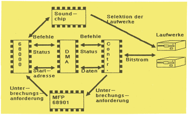 Es zeigt alle Chips, die bei der Ein-/ Ausgabe auf Diskette zusammenspielen. Nicht nur Prozessor, DMA-Controller und Floppycontroller sind -wie man sieht - am Lesen/Schreiben beteiligt. Die Unterbrechungsanforderung des Floppycontrollers, mit der er vehement auf das Ende seiner Arbeit hinweist, gelangt zum MFP68901, einem Baustein im ST, der unter den Chips des ST nur âder Störenfriedâ heiĂt, weil er stĂ€ndig andere bei der Arbeit unterbricht: Er verwaltet alle Interruptanforderungen der Peripherie.