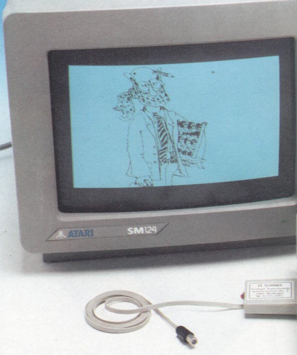 Der Scanner arbeitet mit einem hochauflösenden Reflexgeber von Hewlett-Packard. In der Handhabung ist das Gerät sehr einfach gehalten und ein Eingriff in den Rechner nicht notwendig. Das Modul wird nur in den ROM-Port des ATARI eingesteckt. Der ST SCANNER, wie sich das Gerät nennt, kostet DM 199, — .
