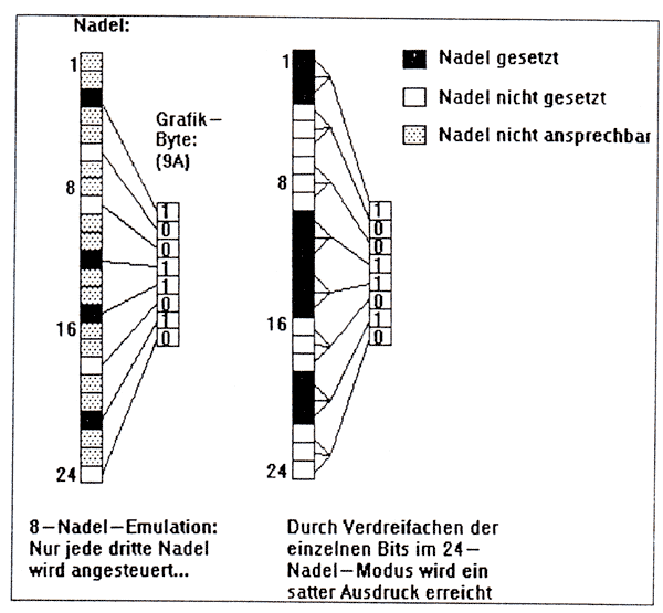Im Zusammenhang mit WORDPLUS ist der Befehl: ESC 2A 04 n1 n2 DATA interessant, weil er die 8-Nadel-Emulation (CRT I, 640 Punkte/Zeile) einschaltet. Wie Bild 1 verdeutlicht, werden die Bits der nachfolgenden Grafikdaten nur jeder dritten Nadel zugeordnet, wodurch dann die ungeliebten LĂŒcken entstehen. Abhilfe kann hier durch Einschalten des 24er Modus mit dreifacher Dichte geschaffen werden (ESC 2A 27). Hier mĂŒssen dann allerdings pro Spalte gleich drei Bytes vorstellig werden, wozu man die von WORDPLUS abgeschickten Daten verdreifacht. Dies muĂ aber bitweise passieren, weil man sonst dieselbe Zeile druckt wie im CRT I-Modus (jetzt halt mit 24 Pins), auf ein Drittel der ursprĂŒnglichen Höhe gestaucht. DafĂŒr aber dreimal untereinander. Der verfremdende Effekt lĂ€Ăt sich auf Dauer ziemlich schwer verheimlichen...