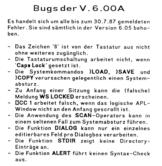 Dem Paket liegt auch eine Fehlerliste bei. Angesichts dessen, daà es kaum fehlerfreie Programme gibt, ist diese Praxis lobenswert. Da gdat an alle registrierten Benutzer die Version 6.05 verschickt, sobald sie freigegeben ist, erhÀlt jeder APL-Eigner eine komplette Fehlerkorrektur und einige neue Features: gegen Porto. So ein Nulltarif ist angesichts der meist kleineren Bugs sehr nobel. Andere SoftwarehÀuser sollten sich daran ein Beispiel nehmen. Der einzige Bug, der mich nachhaltig nervte, betraf einen gelegentlichen Ausstieg des Rechners bei dem Versuch, einen Workspace zu laden.