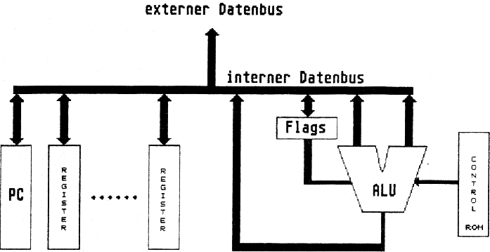 Alle Mikrocomputersysteme sind nach einem ähnlichen Schema aufgebaut, wie es in Bild 1 zu finden ist. Dieser Mikroprozessor hat einen Taktgeber, eine Befehlsdekodierung, ein internes RAM, womit die Register des Prozessors gemeint sind, ein internes ROM, in dem das Mikroprogramm (Firmware) vorhanden ist, und eine ALU -- eine Arithmetisch Logische Einheit (Unit). Dieser Teil des Prozessors ist dem Durchführen von arithmetischen und logischen Verknüpfungen gewidmet, d. h. er hat die Aufgabe bei einfacheren Prozessoren - eine Addition oder Subtraktion oder bei komplexeren Prozessoren wie dem 68000 sogar Multiplikationen, beziehungsweise Divisionen durchzuführen. Obwohl diese Unterstützung des Prozessors im Vergleich zu älteren Prozessortypen, wie zum Beispiel dem 6502 in Bezug auf die Multiplikation schon enorm ist, darf nicht vergessen werden, daß dies nur für den Bereich der GANZEN Zahlen zutrifft!