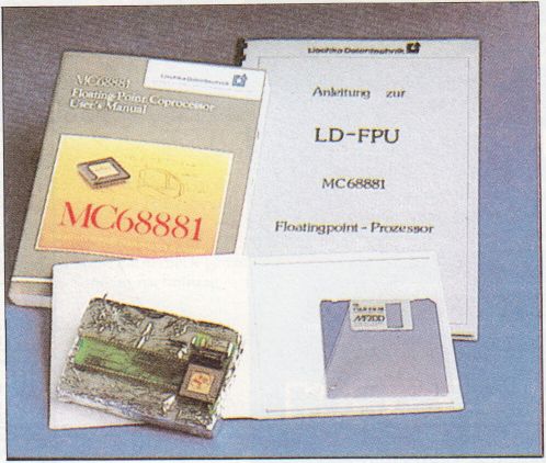 Die Firma LISCHKA DATENTECHNIK ist der erste Anbieter einer Fließkomma-Einheit, die direkt für den ST erstellt wurde. Deren Coprozessorplatine liegt uns als Exemplar vor. Der Lieferumfang des Paketes ist, was nicht unbedingt der Regel entspricht, als äußerst zufriedenstellend zu bezeichnen. Neben der eigentlichen Platine und natürlich dem Coprozessor selbst, liefert Lischka Datentechnik „mehr als ein Pfund Dokumentation“ (Zitat aus der Produktbeschreibung der Firma). Dieses Pfund besteht aus einer ausführlichen Einbaubeschreibung, sowie einer Einführung in die Programmierung des Floating Point Coprozessors. Außerdem wird das sehr gute (und nicht billige) von MOTOROLA herausgegebene USER’s MANUAL des MC68881 mitgeliefert, das auch die letzten Fragen des Programmierers und Entwicklers beantworten wird. Mehrere Libraries für Compilersprachen sind zur Nutzung des MC68881 auf einer Diskette vorhanden.