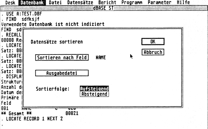All diese Programme können die Datenbankfunktionen von dBase nutzen. Normalerweise ist es am sinnvollsten, sich ein spezielles dBase-Programm zu schreiben; aber auch die direkte Abfrage und Pflege der Datenbank mit dBase ist möglich. Diese direkte Abfrage mit dBase-Befehlen, wurde in der ST-Version dadurch vereinfacht, daß man bestimmte Bedingungen für die Suche/ das Sortieren in der Datenbank mit der Maus bestimmen kann (Bild 2).