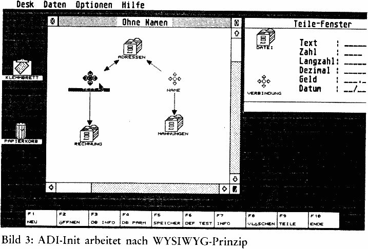 Auf der Systemdiskette der neuesten Adimensversion 2.1 (Bild 3) befindet sich ein unter GEM arbeitendes Programm namens INIT, das die Erstellung neuer Datenbanken extrem vereinfacht. Nach dem Top-Down-Prinzip kann hiermit leicht, mit grafischer GEM-Unterstützung der Aufbau der Datenbank festgelegt werden. Bild 3 zeigt die oberste Ebene beim Entwurf der Datenbank. Hier wird die Verknüpfung der logischen Dateien festgelegt. Der nächste Schritt ist dann die Festlegung des Aufbaus der Dateien (siehe Bild 4). Diese Visualisierung des Vorgangs des Datenbankentwurfs ist sehr vorteilhaft.