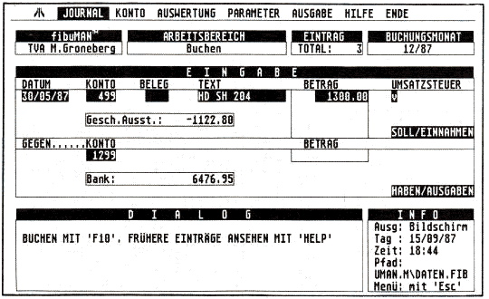 Sind alle Daten korrekt eingegeben, schließt man die Buchung mit F10 ab. Sofort tragen sich in abgetrennten Boxen unter Betrag automatisch Brutto-und Nettobetrag, sowie die anfallende Umsatzsteuer ein. Gleichzeitig werden die Salden von Konto und Gegenkonto aktualisiert und in den entsprechenden Feldern gezeigt. In der Dialogbox erscheint die Buchungsbestätigung „Gebucht“ mit der Anzeige der noch verbleibenden Kapazität (auf eine einseitige Disk passen ca 1000, auf eine doppelseitige Disk ca 2000 Buchungen pro Monat). Der Cursor geht wieder auf das Datumsfeld und man kann die nächste Buchung eingeben.