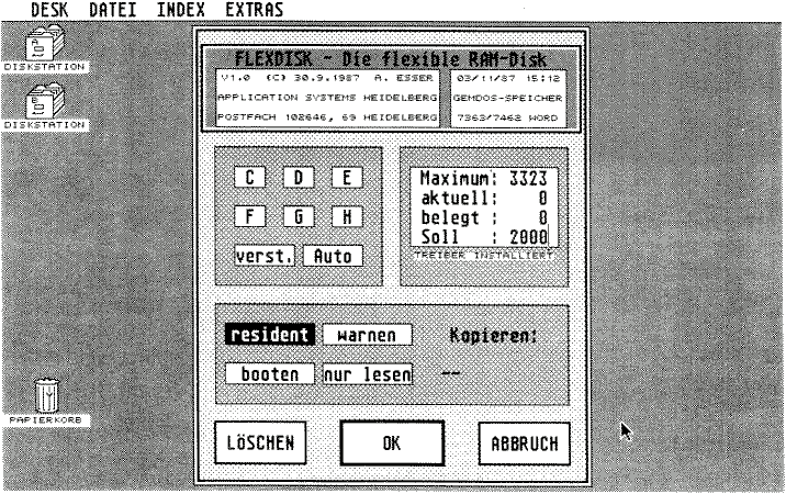 Ein weiteres hervorhebendes Merkmal ist, daß die FLEXDISK den gesamten Speicher als RAM-Disk verarbeiten kann, was im Maximum also 4 Megabyte Speicher (Entwickler hergehört) bedeuten könnte. Dabei ist die zu verwendende Größe von einem Accessory oder einem zusätzlichen (und damit nachträglich startbaren) Programm aus jederzeit einstellbar .