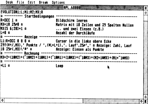 Die Umsetzung dieses Modells in APL erfordert ein bißchen Knobelei, ist aber letzten Endes ganz einfach: Die eigentliche Rechnerei nimmt eine ganze Zeile in Anspruch (ich gebe zu: eine lange). Alles andere ist das Drumherum und die Bildschirmanzeige.