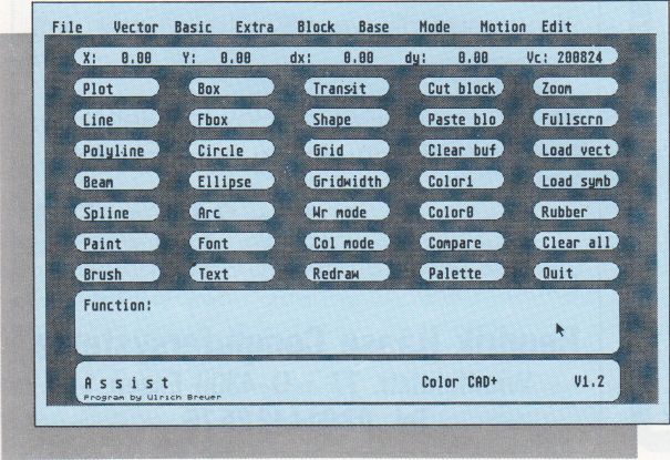 Leider erfordert Assist’ neben dem Multiscan-Monitor einen Schwarzweiß-Monitor. Dort wird dann das Assist’-Menü dargestellt, während auf dem Farbmonitor die eigentliche Zeichnung entsteht, ungestört durch platzraubende Menüs.
