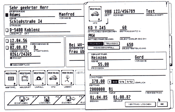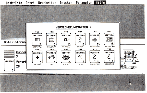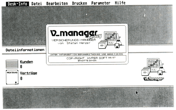 Gestartet wird das Programm aus der Directory heraus wie üblich durch Anklicken des Programmfiles "V_M.PRG". Eine Box für die aktuelle Datumseingabe erscheint. Das Datum wird nach der Eingabe in einer Statusbox geführt, die außerdem noch einige andere für den Anwender wichtige Informationen verwaltet, wie z.B. die Anzahl der Kundendatensätze und der eingetragenen Verträge. Alle Kunden- und Versicherungsdaten werden in einer Datei gespeichert, die beim erstmaligen Benutzen von V-MANAGER angelegt werden muß, und dann immer zur Verfügung steht. Es können sogar mehrere Dateien angelegt und bearbeitet werden. Für die Kundendaten stehen zwei Datenblätter zur Verfügung, die sauber getrennt für die allgemeinen und die spezifischen Personaldaten geführt werden. Die Versicherungsdaten werden übersichtlich im Ordnerkonzept angelegt und stehen auf Tastendruck, nach Ihren Arten (Haftpflicht, Hausrat etc.) geordnet zur Verfügung. Die Ordner sind in drei Bereiche eingeteilt. Zu den allgemeinen Vertragsdatenfeldern sind explizit in jedem Ordner die spezifischen Vertragsdaten-, sowie Vermittlerdatenfelder implementiert worden. Über die Funktionstasten lassen sich alle Vertragsarten abrufen und bearbeiten. Jeder schon bearbeitete Vertragsordner wird auf dem Hauptdatenblatt symbolisch dargestellt, und mit einem entsprechenden Untertitel versehen. Das heißt, Sie sehen schon auf den ersten Blick, welche Versicherungen ein Kunde hat. Gerade in diesem Punkt unterscheidet sich das Programm von seinen Konkurrenten der alten Garde, eine so bestechende Übersicht ist mit einem textorientierten Programm kaum möglich. Eine schnelle Auskunftsbereitschaft wird somit gewährleistet. Alle Ordner und Datenfelder sind aus der Praxis entnommen worden, und ich konnte aus dem großen Angebotsrepertoir an Datenfelder und Buttons keines finden, das nicht seinen Zweck erfüllt hätte.