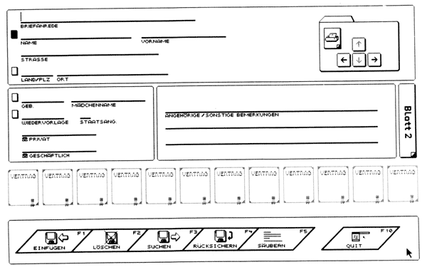 V-MANAGER prosy ist durch ein sogenanntes Hardwaremodul kopiergeschützt, welches vor dem Einschalten des Rechners in den Modulport gesteckt werden muß. Vergißt man dieses, wird das Programm unmittelbar nach dem Start wieder verlassen. Das Modul kann auch beim Arbeiten mit anderer Software eingesteckt bleiben, dadurch entfällt ein lästiges Einstecken des Schutzmodules vor dem Arbeiten mit V-MANAGER. Ein wenig extravagant präsentiert sich die Benutzeroberfläche des Programmes. Man hat sich sogar die Mühe gemacht und die Hauptdatenblätter, sowie die Vertragsordner mit einem Grafikprogramm erstellt, um dem Anwender ein möglichst realitätsnahes Arbeitsumfeld bieten zu können. Ich meine, daß dieses hervorragend gelungen ist.