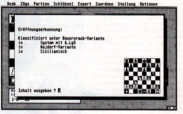 Das beantwortet auch eine Frage, die sich vielleicht mancher schon insgeheim gestellt hatte: Datenbank - gut und schön, aber warum keine Standardlösung, warum kein genormtes Datenformat eines bewährten Systems? Der schachliche Graphikaufsatz ist ein Grund, vielleicht noch wichtiger sind jedoch die Anforderungen, die an die besonderen Zugriffsmethoden und die Effizienz des Aufzeichnungsformats gestellt werden. Darüberhinaus ist folgendes Problem vom ChessBase-Entwickler selbst zunächst völlig unterschätzt worden: Wenn heute, acht Monate nach der Erstveröffentlichung des Programms, z.B. 25% der “Top 100 Men” der schachlichen Weltrangliste einen Atari ST ihr eigen nennen, so waren doch bis auf ein oder zwei Ausnahmen alle diese Spieler mit Computern praktisch völlig unvertraut. Es ist nun offenbar wesentlich einfacher, mißtrauischen PC-Neulingen ein sehr schachspezifisches Programm mit einfach einprägsamen Bedienungsfunktionen nahezubringen, als sie in das Konzept eines relationalen Datenbanksystems einzuweisen. Wenn heute viele Schachgroßmeister und Amateure auf bundesdeutschen “Informationsvorsprung durch Technik” vertrauen, ist dies schließlich sicher auch der GEM-Oberfläche des Atari zu verdanken. 70% aller ChessBase -Anwender haben ihren Rechner zunächst nur für dieses Programm erworben und waren psychologisch als Ersteinsteiger mit der Maus sicher besser bedient als mit einem herkömmlich kommandoorientierten Betriebssystem. Auch bei der gerade fertiggestellten MS-DOS Version von ChessBase wurde Wert darauf gelegt, das gewohnte Bild der Dropdown-Menüs und Dialogboxen ohne Hilfe von GEM-Routinen exakt nachzuempfinden.