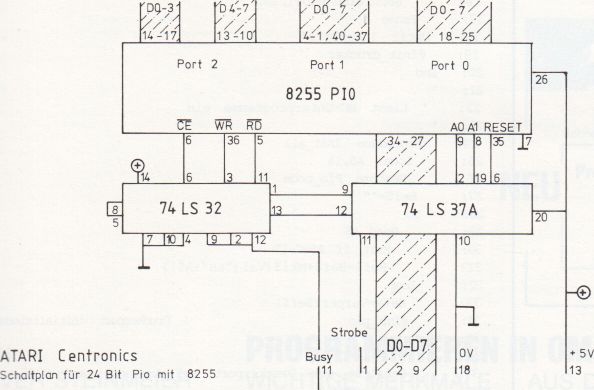 Am Centronicsanschluß befinden sich 10 Leitungen: 8 Datenleitungen und zwei Leitungen, die normalerweise für das Handshaking mit dem Drucker zuständig sind. Die 8255 PIO braucht aber dummerweise 6 Steuerleitungen und 8 Datenleitungen. Nun, die Schaltung benutzt folgenden Trick: Es wird mit den beiden Handshakeleitungen zwischen Daten für die PIO und Steuerdaten, die in einen zusätzlichen 8 Bit-Zwischenspeicher geschrieben werden unterschieden. Da der Baustein weder ein Taktsignal noch ein kompliziertes Timing benötigt, reicht dies aus, um ihn anzusteuern. Ein zweites Problem ist die Stromversorgung, am Centronicsport ist nämlich keinerlei benutzbare Spannung herausgeführt. Aber auch hier gibt es eine einfache Lösung: das Pin 13 des Druckeranschlusses ist nicht belegt. Man kann nun den Atari öffnen und dieses Pin mit +5 V verbinden. Die +5 V sucht man am besten mit einem Voltmeter in der Nähe des Netzteils.