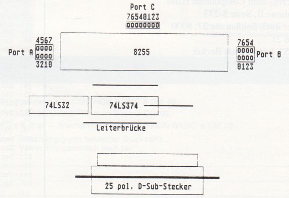 Es gibt bereits diverse Lösungen, die aber allesamt eines gemeinsam haben: sie sind entweder relativ teuer, oder sie blockieren wichtige Anschlüsse (DMA, Rom-Modul, etc.). Auch diese Schaltung blockiert einen Anschluß, nämlich die Centronicsschnittstelle. Aber sie ist billig (ca. 15 DM), und sie ermöglicht es aufgrund des verwendeten Bausteins (eine 8255 PIO von intel). trotzdem einen Drucker anzuschließen.