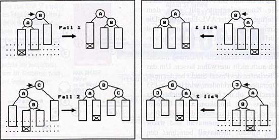 Die gestrichelten Linien verdeutlichen sehr schön, wie die TeilbÀume, die die AVL-Eigenschaft verletzen, bei den entsprechenden Rotationen angehoben werden.