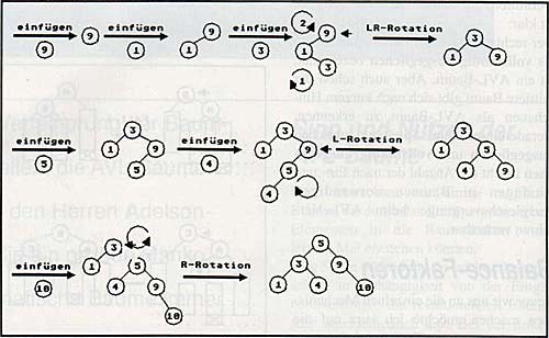 Bemerkenswert ist dabei, daĂ durch lediglich eine (!) Rotation die AVL-Eigenschaft wieder hergestellt wird. Bei der AVL-Löschoperation werden wir damit, im Regelfall, nicht auskommen. Doch zuvor noch ein kleines Beispiel zum EinfĂŒgen. Betrachten Sie die Abbildung 5c. Hier dargestellt ist der AVL-Baum, der durch EinfĂŒgen der Elemente 9, 1, 3, 5, 4 und 10 entsteht. Die Pfeile markieren dabei die Knotenelemente mit, nach dem EinfĂŒgen, verletzter AVL-Eigenschaft. Die Kreise deuten die Rotationen an und dĂŒrften somit die R-L-Namensgebung verdeutlichen.
