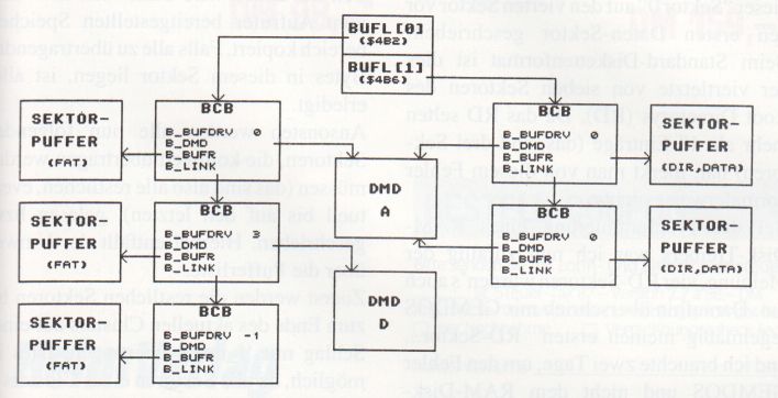 Die AnfĂ€nge der beiden Listen ist in der globalen Systemvariablen âbuff ($4B2) vermerkt: âbufl[0]\ also $4B2, enthĂ€lt den Anfang der FAT-Liste, âbufl[l']â, also $4B6, zeigt auf den ersten BCB der DIR/ DATA-Liste.