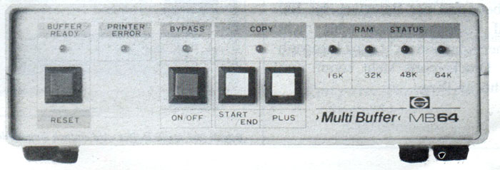 Auf der Vorderseite finden wir von links nach rechts den Reset-Knopf mit darĂŒberliegender âBuffer-Readyâ-Anzeige, eine Anzeige fĂŒr âPrinter Errorâ, den Taster und die Anzeige fĂŒr die âBypassâ-Funktion, eine LED fĂŒr die âCopyâ-Funktion mit den Tasten âStart/Endâ und âPlusâ und vier LEDs, welche den âRAM-Statusâ in den Bereichen 16k, 32k, 48k und 64k anzeigen.