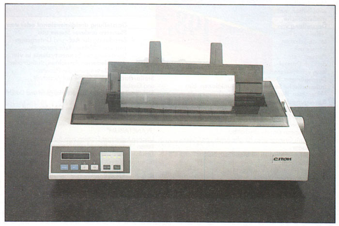 Der Citizen kommt im flachen, weiĂen GehĂ€use daher, aus dem kein Hebel hervorragt. Sein Tastenfeld reduziert sich auf vier ĂŒbersichtliche Tasten, ĂŒber die leider nur die SchriftqualitĂ€t und das Fontmodul gewĂ€hlt werden können. Eine Taste fĂŒr die Einstellung der Schriftbreite fehlt. Unterhalb des Tastenfeldes befindet sich an der Vorderseite die Klappe fĂŒr die DIP-Schalter. Auch unter einer Klappe, jedoch an der Oberseite des GerĂ€tes, finden sich die SchĂ€chte fĂŒr zwei Fontkarten. Das Einlegen des Endlospapiers gestaltet sich als Ă€uĂerst schwierig. Folgt man dabei den Anweisungen des Handbuchs, so verrenkt man sich fast die Finger, denn immer sind Teile der Einzelblattrutsche im Weg. Erst wenn diese entfernt ist, wird es etwas einfacher. Zu gut haben es die Konstrukteure mit einer Automatik zum Einzug des Papiers gemeint: Meldet der Papiersensor neues Papier, so beginnt der Drucker sofort, es weiterzuziehen. Das geschieht ungeachtet irgendwelcher Hebelstellungen, obwohl dafĂŒr der Papierandruckhebel erst in die âEinrichtenâ-Position gebracht werden mĂŒĂte. So wird manches Blatt in der Mechanik zerknĂŒllt. Erschwerend kommt hinzu, daĂ just der entscheidende Papiersorten-Hebel unter einer Klappe liegt, die die gesamte OberflĂ€che des Druckers bedeckt. Das Einlegen von einzelnen BlĂ€ttern gestaltet sich zwar erheblich einfacher, erfordert aber auch FingerspitzengefĂŒhl. Hinzu kommt wieder die Automatik, die ohne Vorwarnung oder Befehl das Blatt einzieht. Der Citizen ist der einzige Drucker im Test, der ĂŒber keine Papierparkfunktion verfĂŒgt, so daĂ die MĂŒhsal des Einlegens von Endlospapier nach jedem Einzelblatt wieder ansteht.