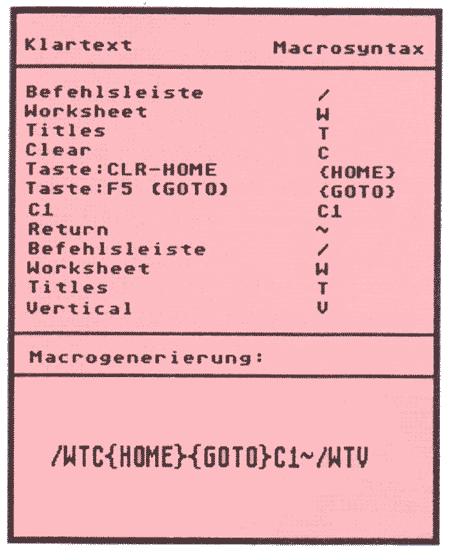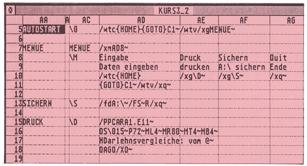 Alle Tastenanschläge erhalten ein Kürzel, das mit den Anfangsbuchstaben der Menüzeilen identisch ist, Funktions- und Sondertastenanschläge werden in spitze Klammern {} gesetzt und mit Klartext der Anweisung gefüllt. Ausnahmen gibt es hier auch, denn die Return-Taste muß mit dem Sonderzeichen ~ übergeben werden. Wie ich Sie bereits kenne, haben Sie fast alles verstanden und könnten Ihr Arbeitsblatt gemäß der Abbildung 3 aufbauen.