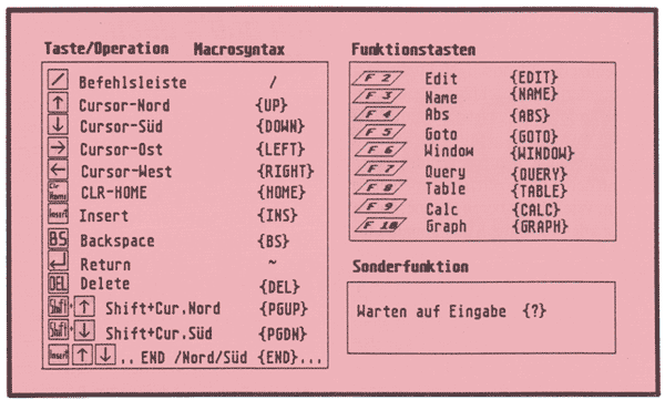 “Kann ich nie, lerne ich auch nicht, kann ich nicht gebrauchen !” Ich höre es ja, Sie brauchen nicht auf mich loszuwettern. Es ist eben sehr umfangreich, dieses VIP-Professional, stellen Sie sich mal vor, es gibt auch noch den Teil Datenbank und Grafik, der ebenfalls behandelt werden möchte. Sie haben richtig gehört, unsere bis jetzt behandelten Formeln, Macros und Funkionen betreffen nur den Kalkulationsteil. Au weh ! Hoffentlich springen mir nicht die Leser ab, wenn ich Sie mit dem gesamten Sprachschatz konfrontiere.
