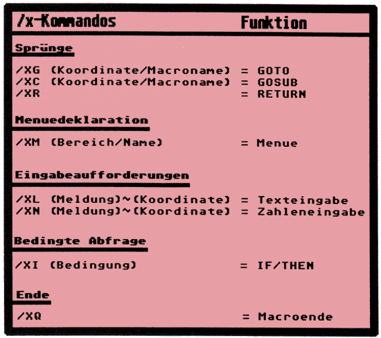 In dem Menüaufbau traten erstmals die /x-Kommandos auf, die es ermöglicht haben, Sprungziele innerhalb eines Menüs zu gestalten, sowie eine Menüleiste in der VIP-Shell einzublenden. In Abbildung 6 erhalten Sie die Gesamtübersicht der /x-Kommandos.