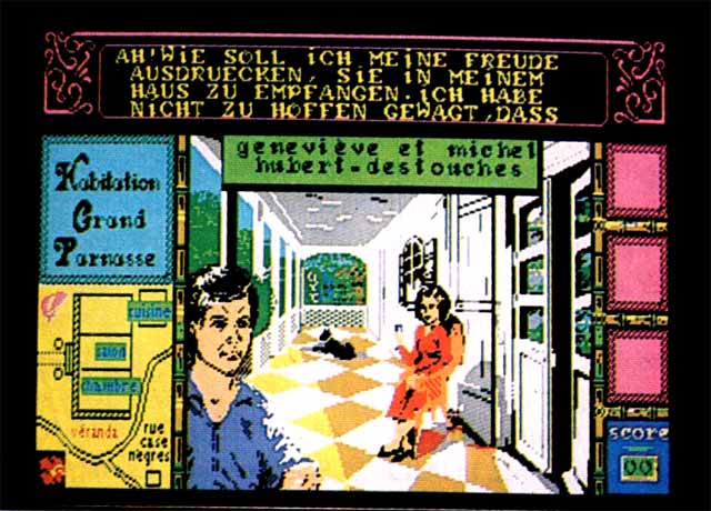 So befindet Ich auf der Insel beispielsweise ein alter Mann, der sich perfekt in der Geschichte des Landes auskennt. Der Insulaner stellt Ihnen Fragen über die Insel, die Sie im Multiple-Choice Verfahren richtig beantworten müssen. Die Fragen sind eine harte Nuß. Wußten Sie beispielsweise, daß man Begasse zur Produktion von Zucker verwendet? Durch genaues Lesen der Anleitung und durch intensives Probieren kommt man aber den richtigen Antworten auf die Spur. Wenn man dem alten Insulaner alle Fragen richtig beantwortet hat, schenkt einem dieser eine Flasche. Was es damit auf sich hat, konnte ich während meines Tests nicht herausfinden. Nach dem Rätselstündchen beim alten Insulaner schaute ich mir eine Plantage an und besuchte meinen Auftraggeber Monsieur Destouches. Dort sollte ich mit meinen parasychologischen Fähigkeiten zu einer verstorbenen Frau Kontakt aufnehmen. Mevilo präsentiert sich in einer außergewöhnlichen, farbenfrohen Grafik. Soundeffekte, wie das digitalisierte Grunzen eines Schweins oder französische Musik sorgen für eine gelungene Atmosphäre. Coktel Visions neuestes Adventure versteht es, den Spieler für lange Zeit zu unterhalten. Mevilo ist eine Bereicherung für den Softwaremarkt. Durch das Spiel kann man viel über Martinique erfahren. Man lernt einen Teil der französischen Kultur kennen, muß Indizien kombinieren und hat mit der spannenden Handlung viel Spaß. Kein Wunder, daß Mevilo schon eine hohe Auszeichnung bekommen hat. Der französische Premierminister Chirac verlieh der Autorin von Mevilo zur Veröffentlichung die silberne Medaille der Stadt Paris. Als Bonus liegt der Verpackung eine Cassette mit französischer Musik und ein Rezept für ein französisches Spezialgericht bei. Liebhaber von anspruchsvollen Computerspielen kommen mit Mevilo voll auf ihre Kosten.